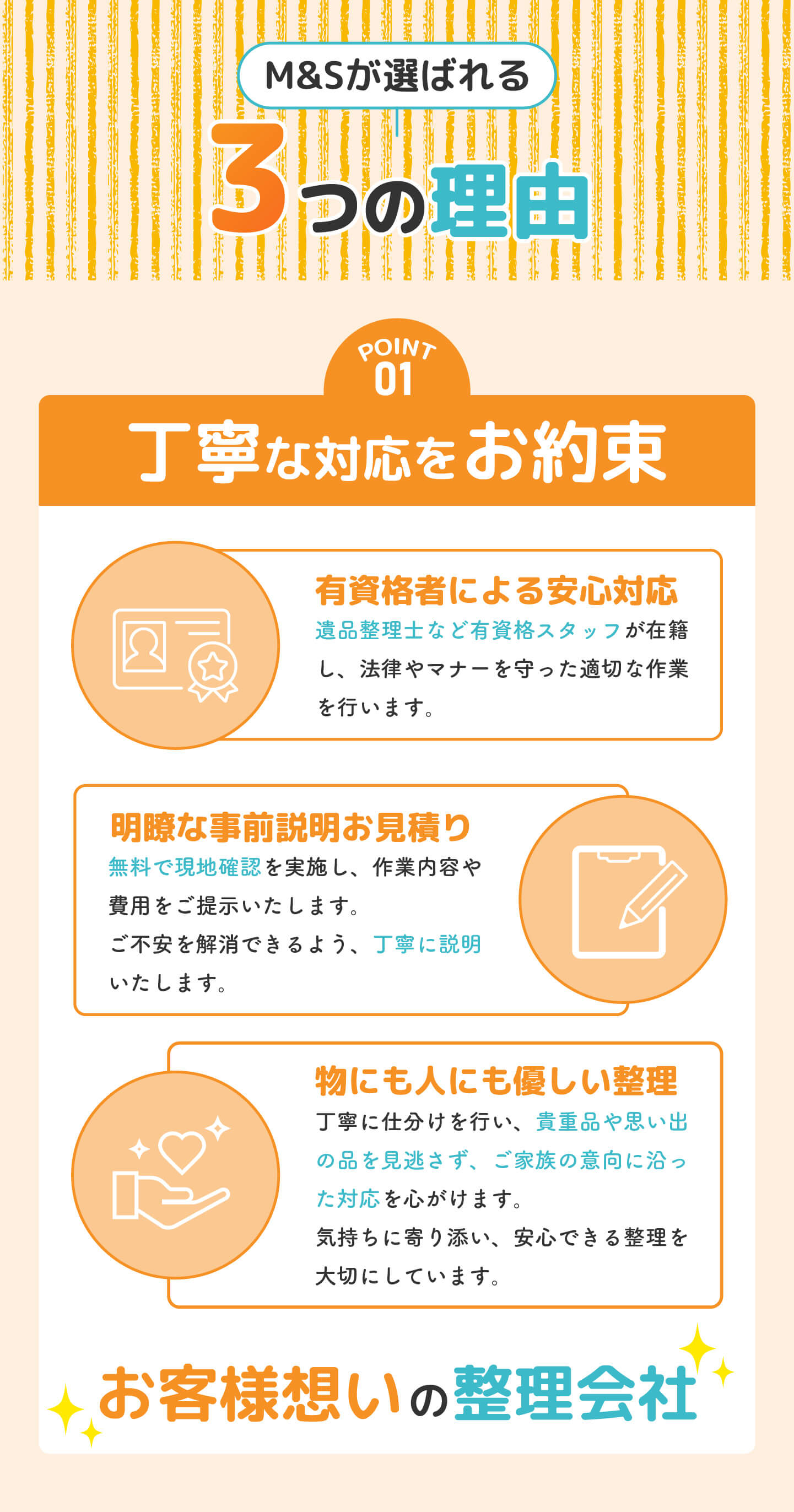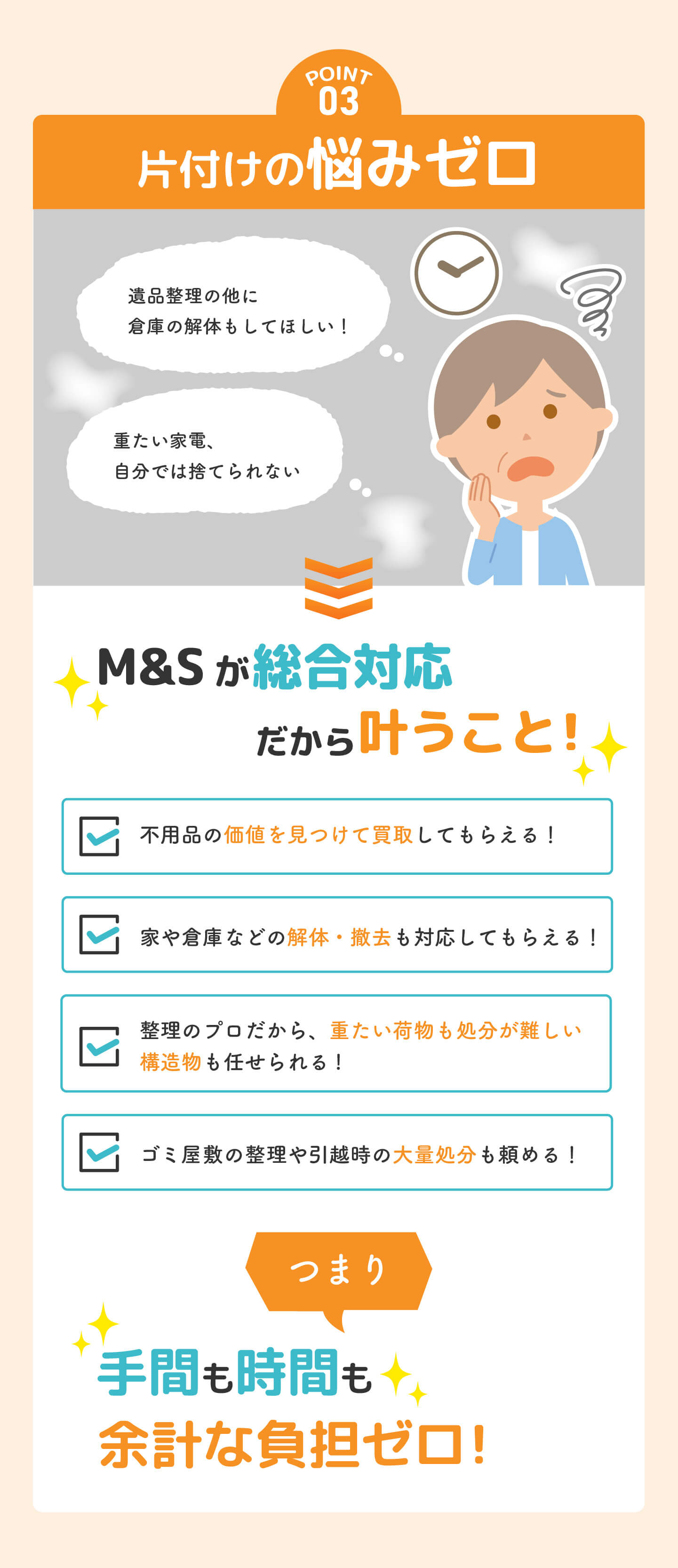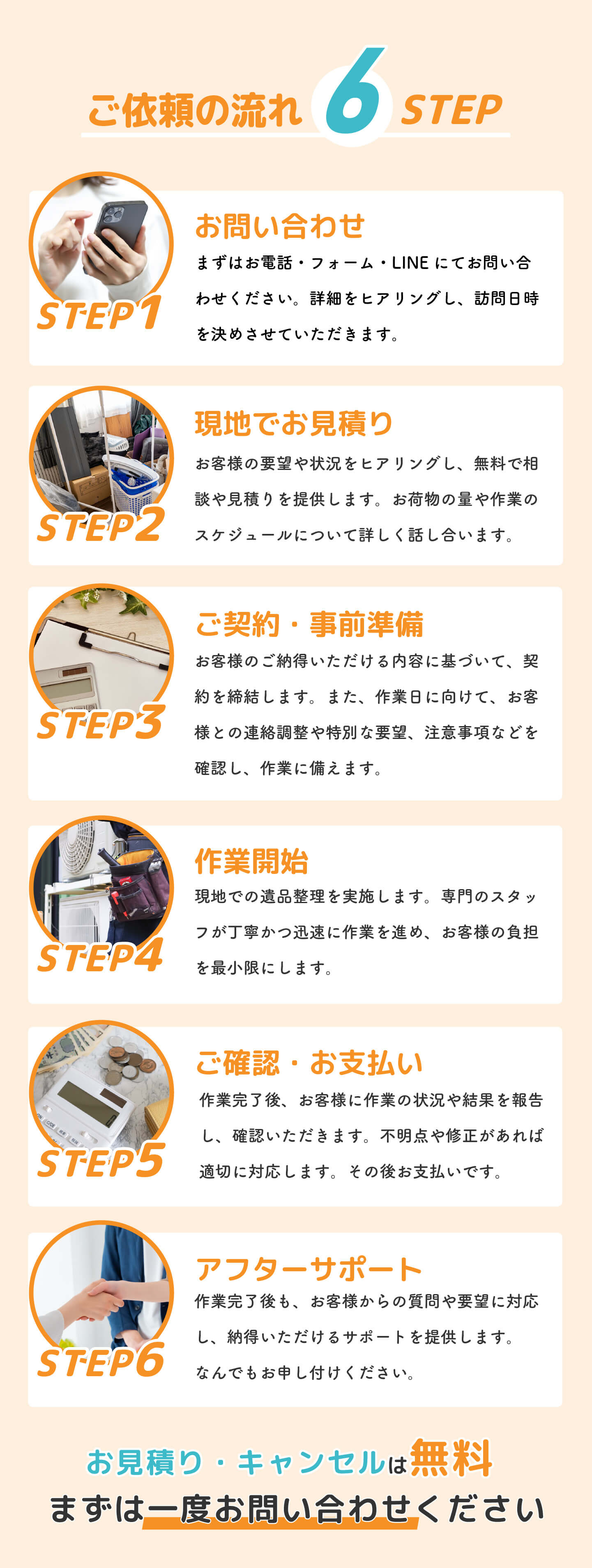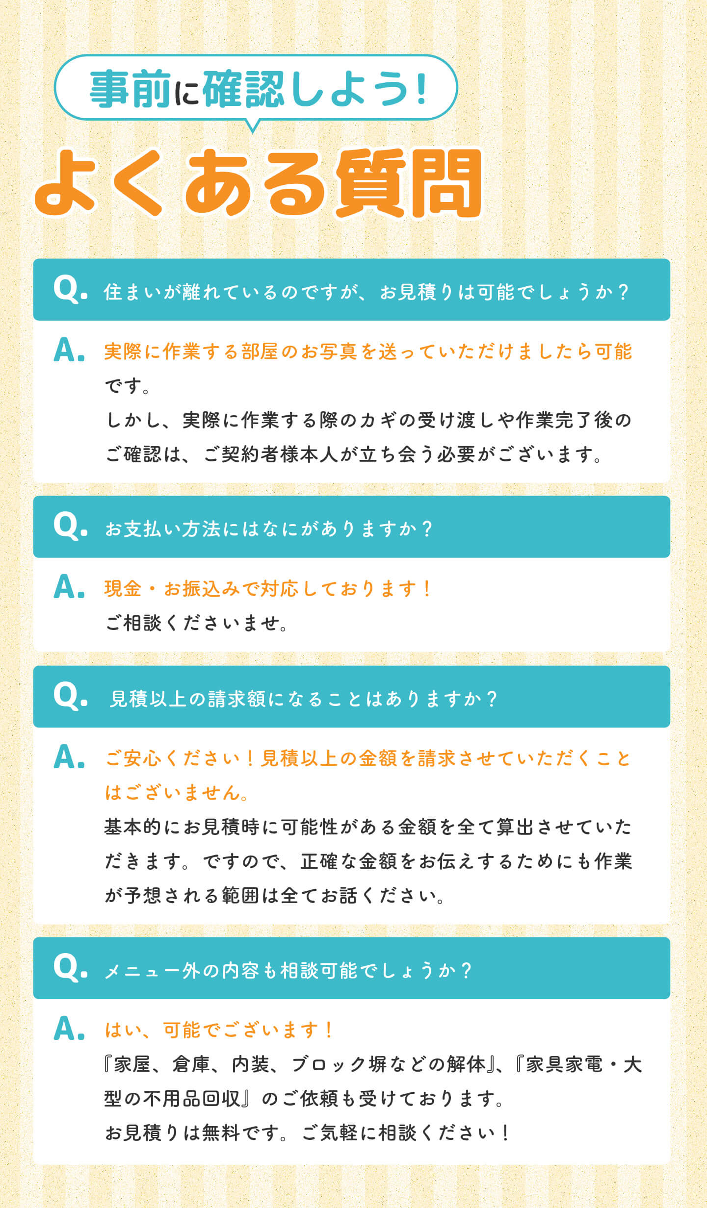 | 事業内容 | 遺品整理,生前整理,不用品回収,買取,解体,撤去 |